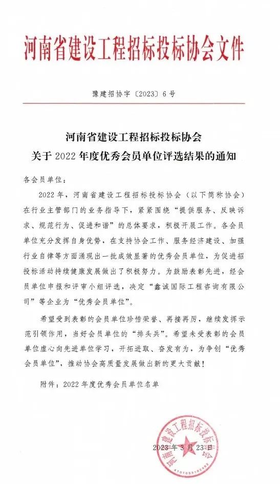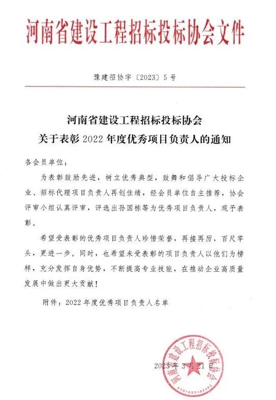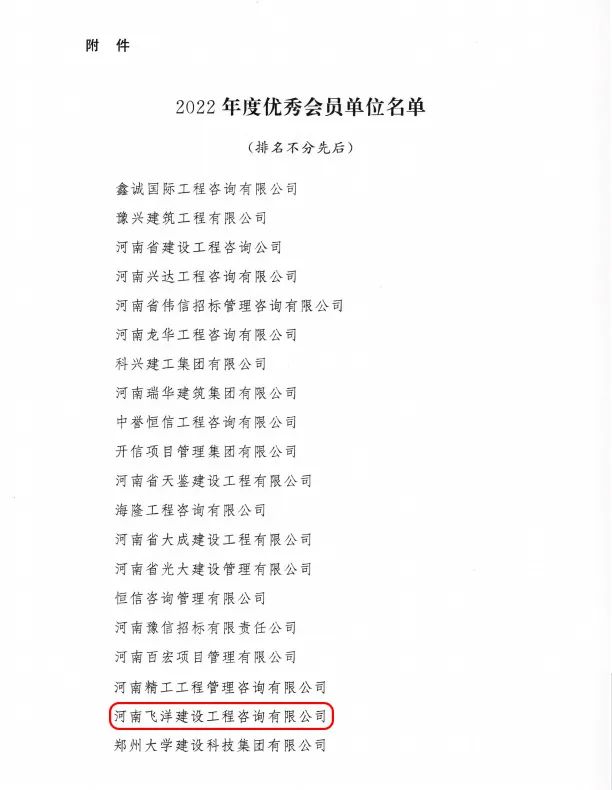 近日,河南省建设工程招标投标协会公布了《关于2022年度优秀会员单位评选结果的通知》、《关于表彰2022年度优秀项目负责人的通知》,飞洋咨询荣获“河南省建设工程招标投标协会2022年度优秀会员单位”称号,我司王英荣获“河南省建设工程招标投标协会2022年度优秀项目负责人”称号!